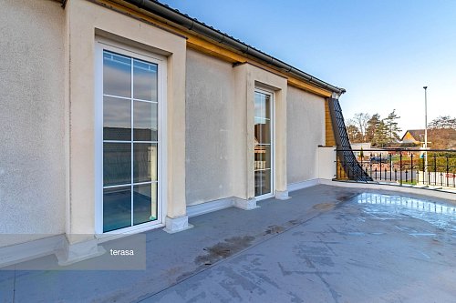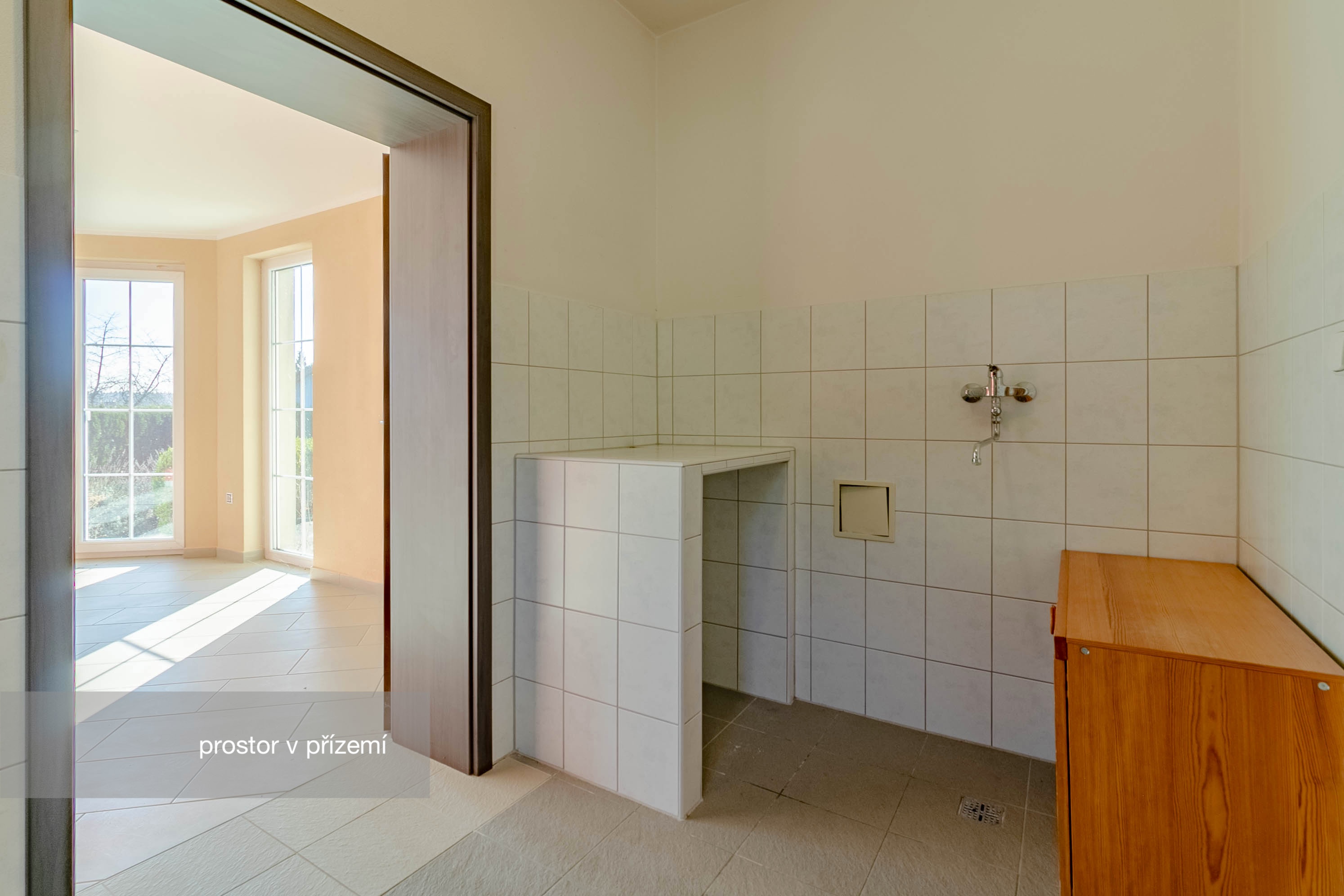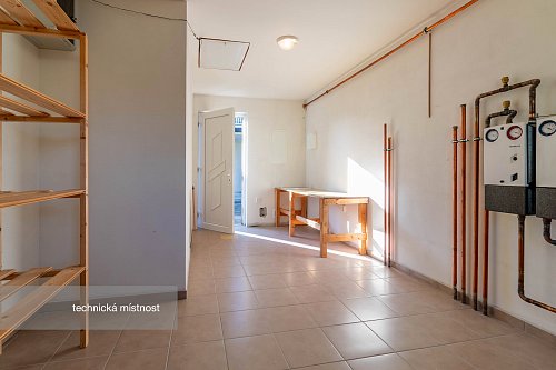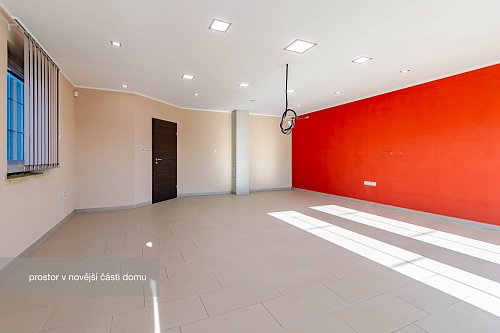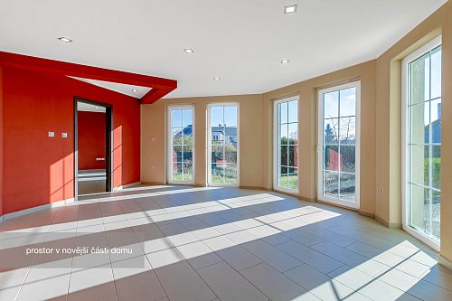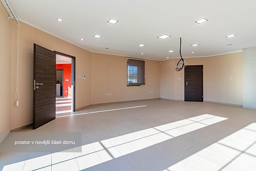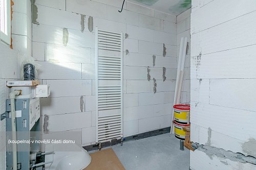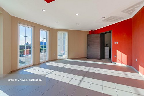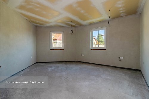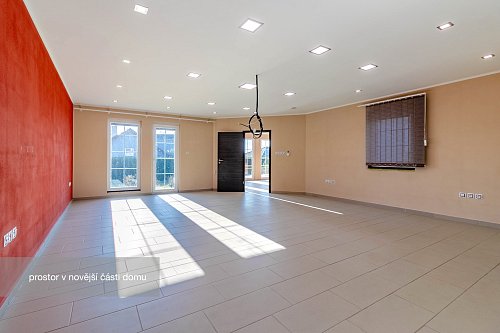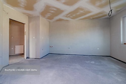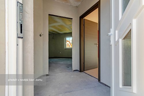 Novější část je o výměře 92 m² a dispozici 2+1, kde koupelna a kuchyň jsou připraveny k finalizaci dle představ budoucího majitele. Tato část může sloužit nejen jako samostatné bydlení pro členy rodiny, ale např. pro pronájem nebo jako kanceláře a díky samostatnému vstupu nenaruší soukromí hlavní části domu.